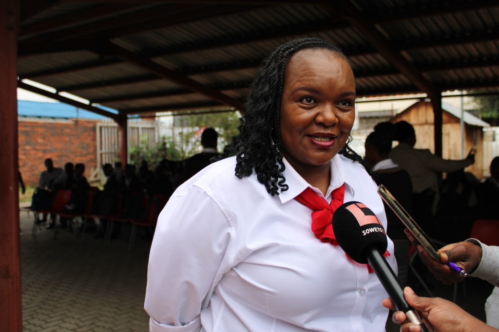 Corporate social responsibility manager at ABB South Africa Cynthia Khoali faces the press soon after the donation of the STEM dictionaries. Photo: Sipho Siso