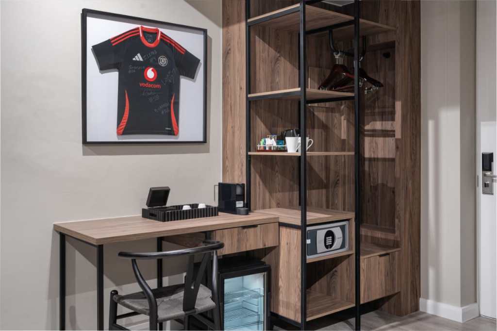 The new themed rooms feature a striking design that blends the Orlando Pirates’ signature of black-and-white colours with a coastal aesthetic. Highlights include signed memorabilia, a custom-designed bathroom adorned with a generic pattern reminiscent of a soccer ball, and a frameless acrylic panel featuring Orlando Pirates players.